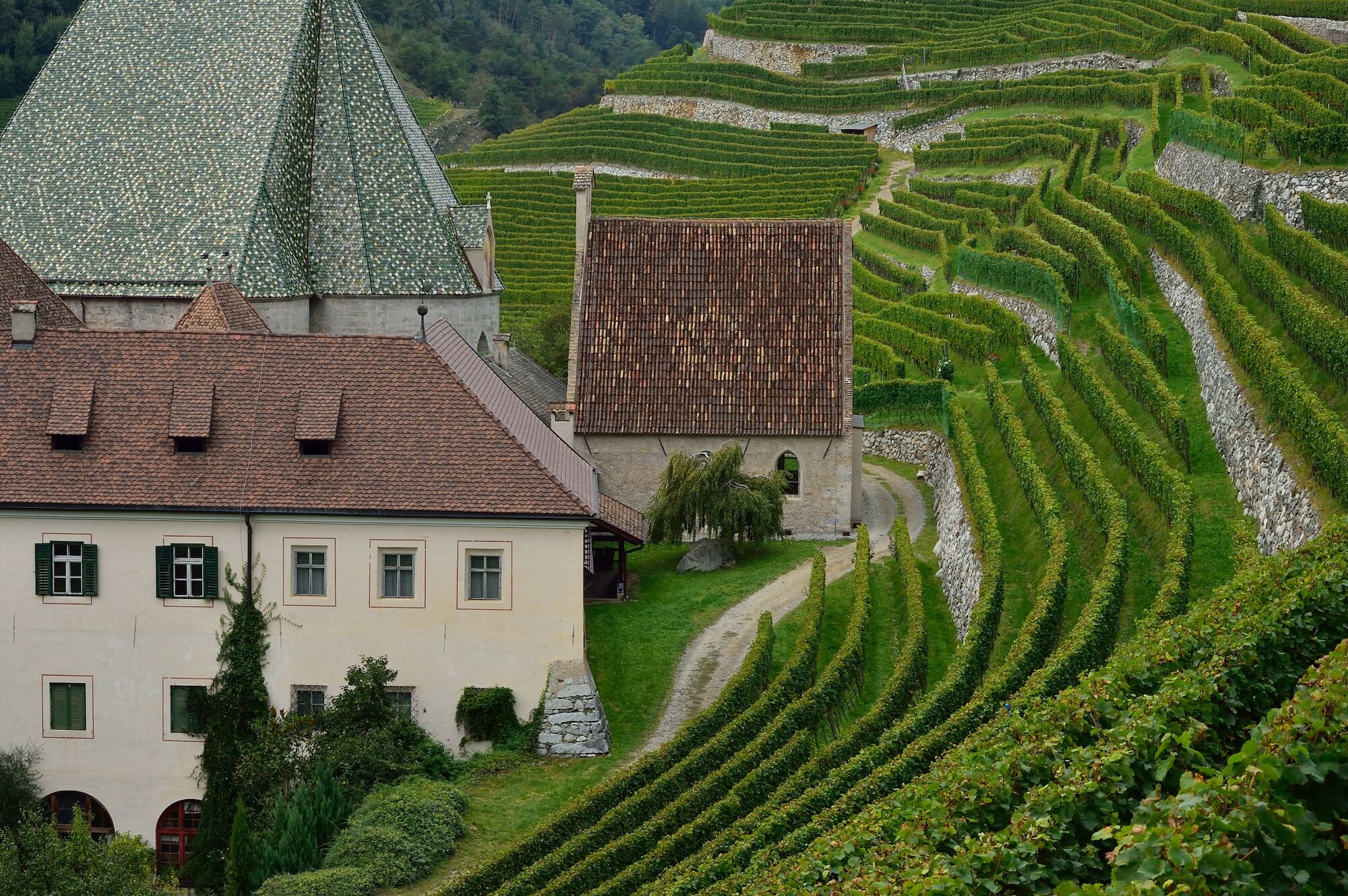 E' inoltre tra le cantine attive più antiche al mondo. Sin dalla sua fondazione nel 1142, infatti, il monastero ha potuto contare su svariati vigneti, oltre che masi agricoli e terreni. Grandi vini grazie alla combinazione ideale di clima, terreno e varietà di vitigno nella conca valliva di Bressanone che, con le sue basse temperature e i suoi leggeri terreni di depositi morenici, trovano le proprie condizioni ideali il Kerner, il Sylvaner, il Riesling e il Grüner Veltiner. Il risultato sono vini bianchi freschi e fruttati. Molto più sud, a Bolzano, il clima è più caldo, le viti crescono su terreni porfidici. In queste condizioni sono a proprio agio soprattutto il Lagrein ma anche la Schiava. E a Cornaiano, dove predominano terreni magri, ghiaiosi e argillosi, cresce il nostro Pinot nero.