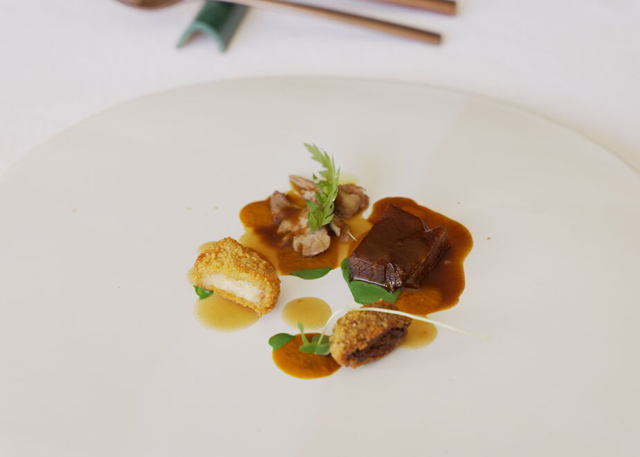 Da qui si passa a un piatto di quinto quarto, ideato per valorizzare alcune pietanze della tradizione piemontese come il fritto misto, la finanziera e il bollito. Il piatto propone creste di gallo, animelle, rognone e guancia abbinate a due tipi di bagnetti, verde e rosso.