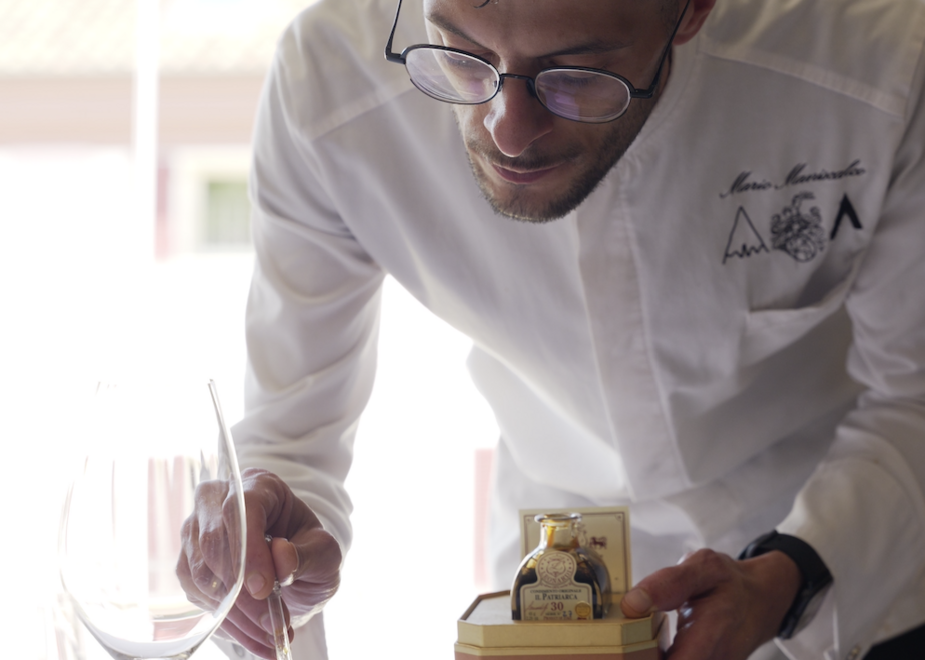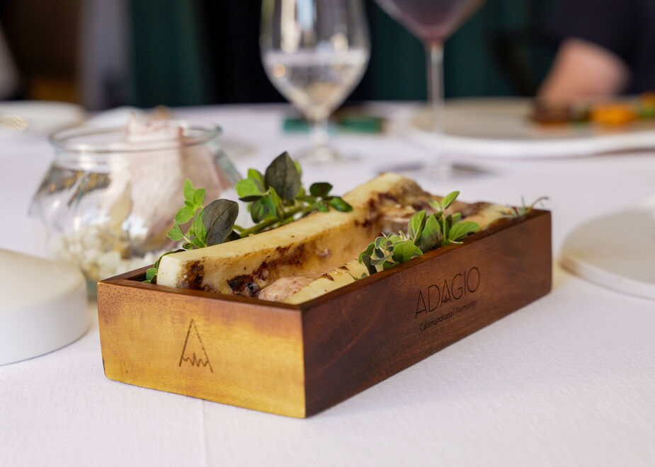 È all’interno del Relais Almaranto, un fienile settecentesco nel cuore del Monferrato incontaminato, che ha sede Adagio, il fine dining con 30 coperti che dal 2022 è guidato dallo chef Mario Maniscalco, classe 1993, siciliano d’origine e piemontese d’adozione.