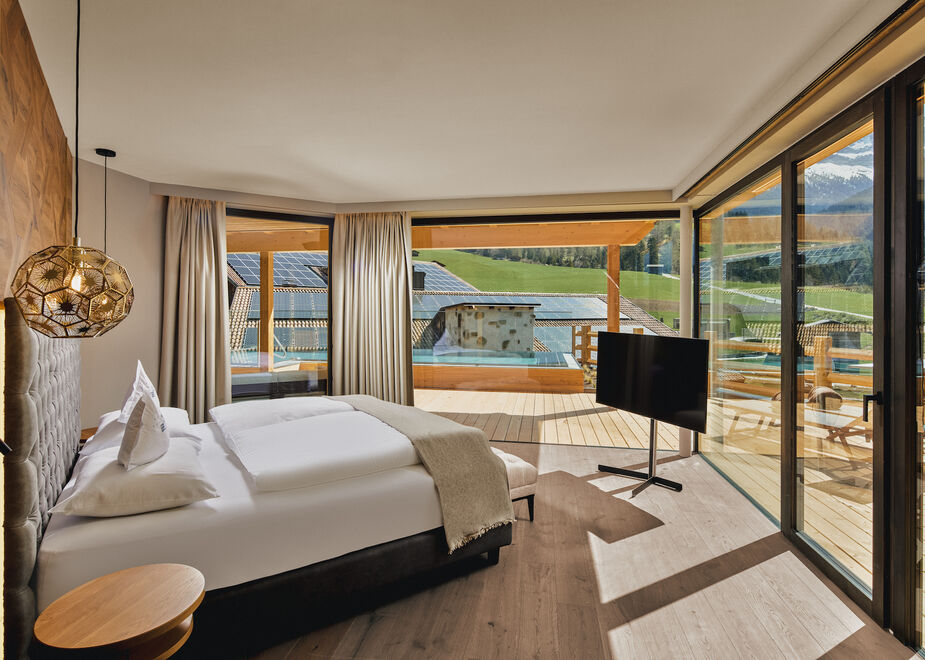 Un’esperienza che raggiunge il suo apice se per il proprio soggiorno al Cyprianerhof si sceglie l’esclusiva suite Antermoja con private spa e infinity pool privata sulla terrazza panoramica. In 93 metri quadrati di estensione complessiva, questa suite da sogno nelle Dolomiti ospita un accogliente soggiorno con un ampio e comodo divano. Protagonisti dell’arredamento in stile moderno alpino sono i colori caldi del legno di quercia, la quarzite argentea e i morbidi tessuti delle confortevoli sedute. Dal salotto si può accedere alla camera da letto con vista panoramica, cabina armadio e bagno, nonché alla terrazza di 72 metri quadri che circonda la suite, sopra ai tetti dell’hotel: la suite Antermoja si trova infatti al quarto piano, il più alto del Cyprianerhof, in una posizione che garantisce totale privacy ai suoi ospiti. La terrazza panoramica con vista sul maestoso Catinaccio ospita una infinity pool lunga ben 8 metri con acqua riscaldata a 32°. All’interno della suite, trova posto anche la zona wellness privata con sauna e bagno turco nonché un’ampia zona doccia e vasca da bagno.
