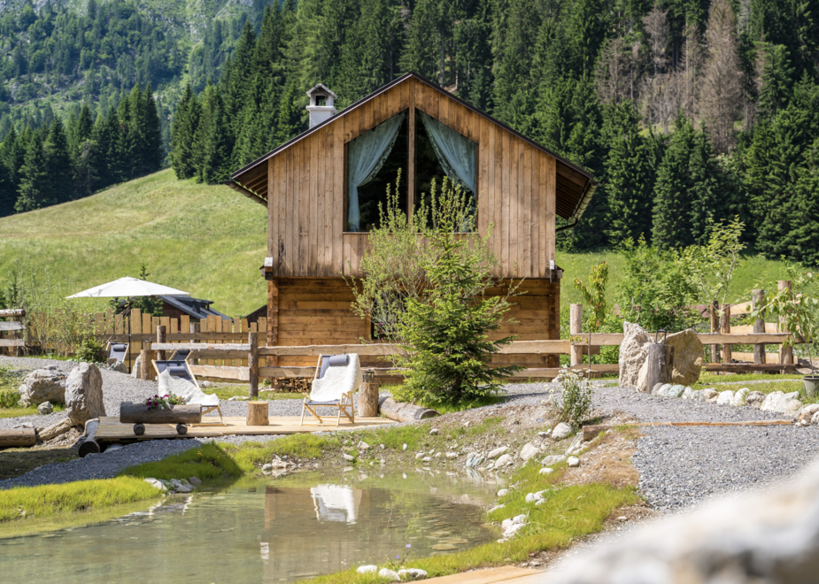 Eirl Dolomites Retreat Sappada è stato interamente pensato e costruito da Silvia e Max in economia diretta, utilizzando l’antica tecnica alpina blockbau e impiegando solamente materiali locali sappadini: legno di abete rosso, legno di larice e marmo Grigio Carnico, oppure, per gli arredi di design, materiali ecologici quali juta e canapa. L’attenzione alla sostenibilità ambientale è da sempre un valore radicato nella filosofia di Eirl, in particolare, per la gestione energetica, grazie alla collaborazione con Luciano Biolo titolare dell’azienda Termotecnica B&B di Verona, è stata progettata una centrale a biomassa in grado di riscaldare l’intera struttura utilizzando esclusivamente legna di scarto trasformata in cippato. Come Luciano, altre figure sono fondamentali per la realizzazione delle idee di Silvia e Max: il perito Michele Festini e la falegname Manuela Fauner che, ancora oggi, contribuiscono attivamente alla crescita di Eirl. Gli spazi sono stati progettati con grande attenzione per garantire a ogni cliente il massimo della privacy e del comfort. L’area degli chalet è separata da quella dei camper grazie a un elegante ponticello in legno che accompagna gli ospiti verso un’oasi di relax. In inverno, proprio sotto il ponte, passa la pista da sci di fondo: una scena dal sapore folkloristico, che richiama le atmosfere autentiche delle Alpi e l’armonia tra architettura e natura. Anche le case mobili sono posizionate con un’angolatura strategica, così da mantenere la giusta riservatezza, valorizzando al tempo stesso la vista sulle Alpi di Sappada.