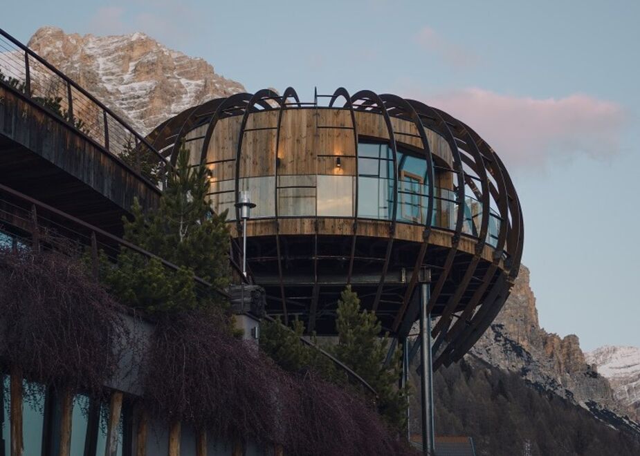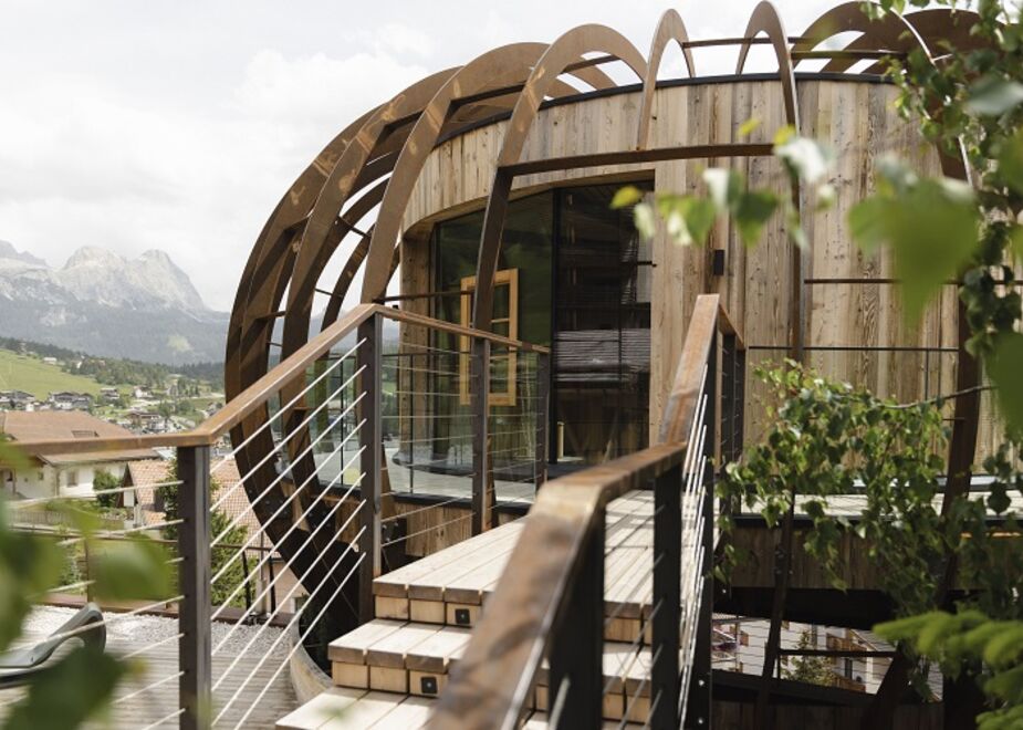 Elements offre una visuale panoramica e completa sul paesaggio Dolomitico circostante grazie alla grande vetrata; inoltre, ruota su se stessa a 360° ed è sospesa a 9 mt di altezza dal suolo. «Un progetto senza eguali sia strutturalmente che concettualmente: Elements, con la sua forma cilindrica, rotante e sospesa a 9 mt di altezza, simboleggia il campo energetico autosufficiente di tutte le forme viventi; inoltre, invita all’introspezione permettendoci di attingere al nostro immenso potenziale in mezzo al movimento incessante del mondo» spiega la Widmann. Proprio per queste sue caratteristiche, la sauna si è aggiudicata un doppio riconoscimento al DNA PARIS DESIGN AWARD 2023, nella categoria Design/Hospitality e in quella Architecture/Hospitality. Elements Sauna riprende alcune filosofie e tradizioni tra le più antiche, che vedono l’uomo al centro di un rapporto strettissimo con la natura e le energie che questa sprigiona. Sin dall’esterno, l’ospite ritrova e diventa parte integrante di questo circolo di energie vitali in prima persona. Il desiderio della famiglia Crazzolara, infatti, non è solo quello di fare vivere agli ospiti un’esperienza di relax fine a se stessa, ma di condurli in un percorso introspettivo consapevole che permetta di attingere all’enorme potenziale che esiste all’interno di ognuno.
