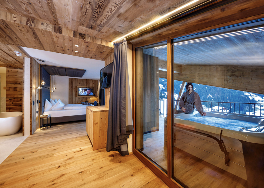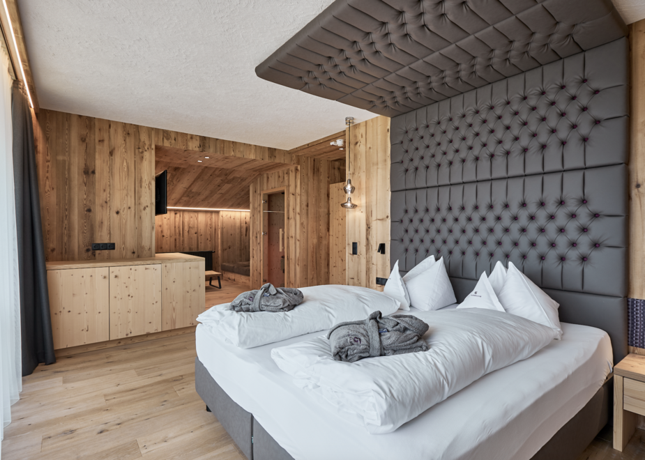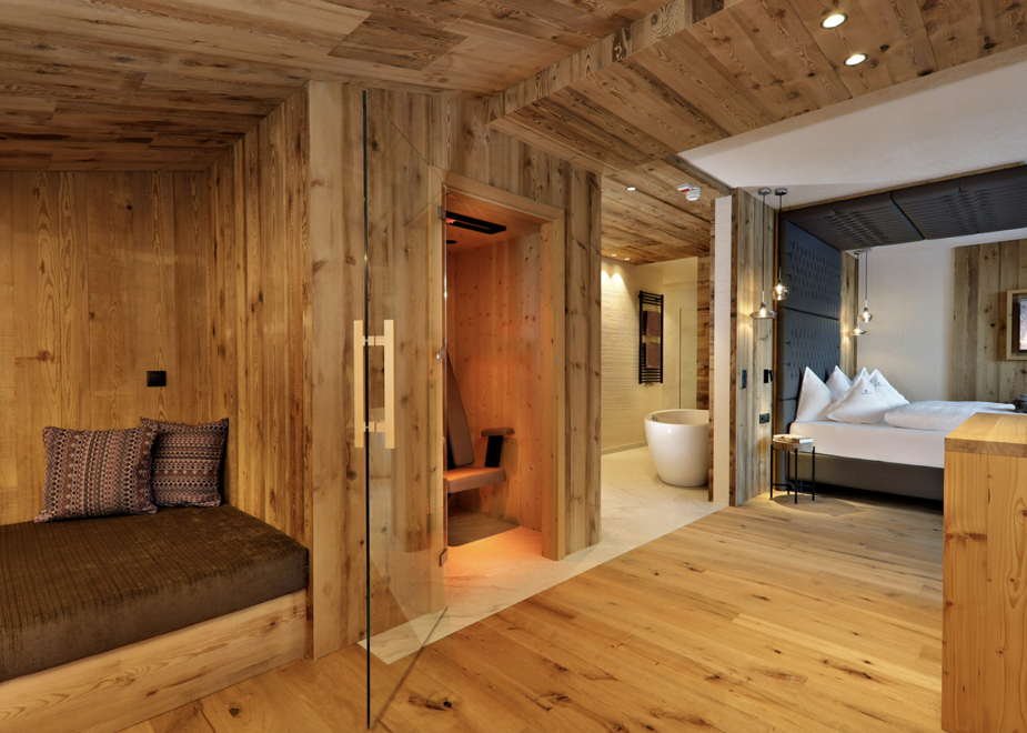 Combinare il lusso e una profonda connessione con la natura è il sogno di chi desidera concedersi un momento di totale riposo senza rinunciare al comfort. Così l’hotel Gassenhof, 4* S di Racines, propone ai suoi ospiti un nido accogliente, dove design e servizi di alto livello sposano il territorio e la sua energia. E per un soggiorno che garantisce, tra l’altro, il piacere di un’assoluta privacy, ha progettato la Suite Argintum, dotata di comfort e facili-ties che permettono di vivere momenti di relax senza uscire dalla propria stanza. 70 mq in cui ri-generare corpo e spirito, in un’atmosfera che unisce eleganza e purezza, con vasca idromassaggio panoramica e cabina a infrarossi.