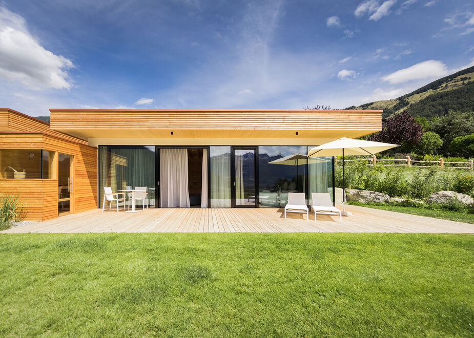 Gli chalet Hortus sono situati in un’area più riservata dell’hotel, immersa nel verde: dalla reception si scende al piano sottostante dove trovano posto la Mii:Amo spa con piscina, hamam, saune e centro benessere. Da qui, un passaggio riservato conduce gli ospiti direttamente al proprio chalet di circa 100 metri quadri, ai quali si aggiungono i 30 metri quadri della terrazza dotata di sauna, vasca idromassaggio e accesso al giardino privato con un fantastico panorama che si apre sulle soleggiate distese della Val Venosta, incorniciate dalle vette alpine su cui si snoda il confine tra Italia e Svizzera. All’interno, lo chalet è diviso in due ambienti principali: si entra in una confortevole zona giorno, dalla quale si accede a un’ampia camera con cabina armadio e vasca da bagno freestanding, un moderno bagno e, infine, al piano superiore dove trova posto un ulteriore spazio relax con vista panoramica. La luce naturale che entra dalle ampie vetrate e gli arredi realizzati in legno pregiato contribuiscono a creare un’atmosfera speciale, che permette di godersi a pieno l’esperienza “Silent Luxury”.