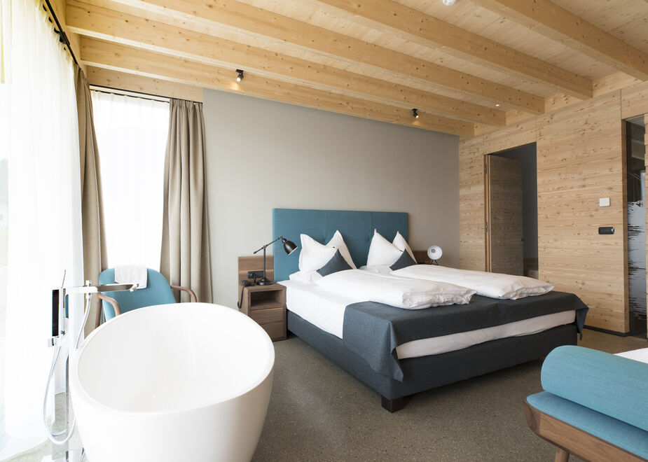 A separare i riservati chalet dal corpo principale della struttura – dove trovano posto le 40 camere dell’hotel, l’area wellness, il Lounge bar 1981 e il ristorante Pobitzer – è un vasto giardino wellness nel quale è presente il laghetto balneare bio-naturale di recente realizzazione, a cui si può accedere direttamente dalla rinnovata Mii:Amo spa oppure dalle suite Laguna, dotate di pontili privati. Le limpide acque del laghetto, trattate in modo completamente biologico tramite la coltivazione mirata del biofilm, alla sera creano suggestivi riflessi e giochi di luce nelle stanze che vi si affacciano. Oltre l’ampio giardino benessere, si estende un vigneto in cui, a oltre 1000 metri di altitudine, vengono coltivati vitigni autoctoni quali Souvignier Gris, Solaris e Muscaris.