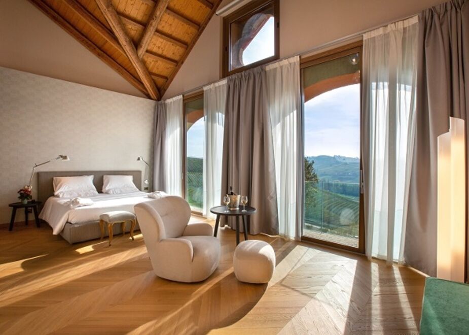 L’ospitalità garantita dal Villaggio Narrante segue il medesimo approccio, coniugando sapientemente lusso e rispetto della tradizione. La proposta di punta di Fontanafredda, in questo senso, sorge sul crinale dell’evocativa collina Gallareto, da cui prende il nome: Cascina Galarej è un hotel di charme a 4 stelle che permette di godere della vista a tutto tondo sui 120 ettari di vigneto di proprietà dell’azienda, coltivati a biologico, e sul pittoresco castello di Grinzane Cavour. L’albergo nasce da un progetto di ristrutturazione basato sul concetto di “ospitalità diffusa”, attuata attraverso il recupero di edifici esistenti da riqualificare ad uso ricettivo. Nel caso specifico, una cascina di Fontanafredda costruita nel 1867 e abitata per anni dai mezzadri delle cantine.