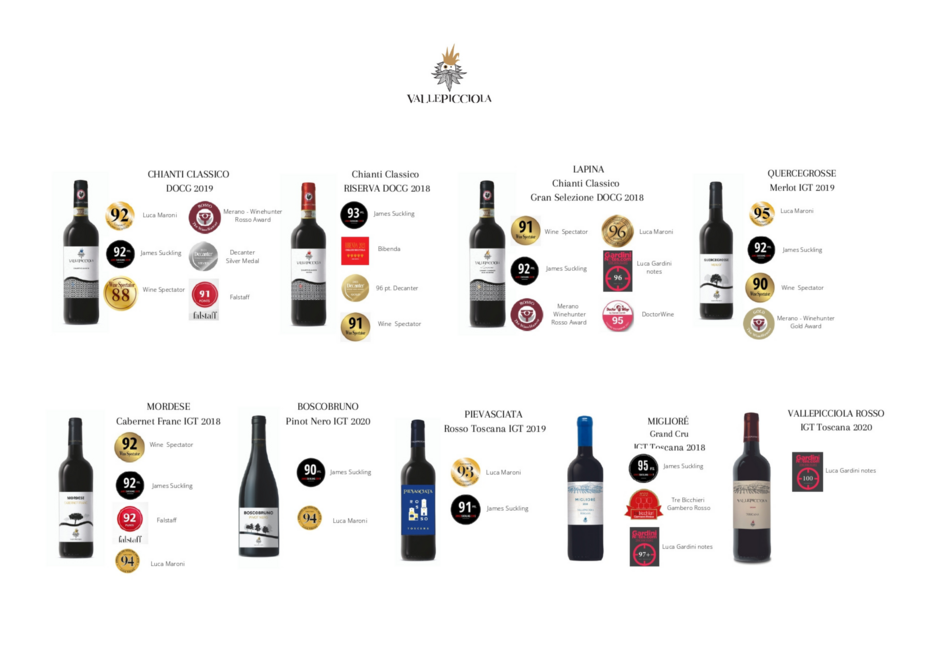I vini di Vallepicciola racchiudono l’anima della Toscana e del Chianti Classico e sono il frutto di tecnologie avanzate che guardano al futuro ma anche di mani attente e amore per la terra e la vite, elementi fondamentali quando si vuole produrre vino di qualità. Vallepicciola rispetta la tradizione e il territorio che la ospita e, anche quest’anno, ha visto premiati molti dei suoi vini, positivamente accolti dalla critica nazionale ed internazionale più nota e autorevole, proprio a conferma dell’impegno costante che permette a questa grande realtà vitivinicola di dare vita a vini sempre di altissimo livello.
