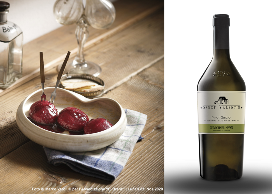 Il Pinot Grigio Sanct Valentin nasce nel 1986 quando, per la prima volta, viene vinificato in purezza ed affinato in piccole botti. L’espressivo Pinot Grigio Sanct Valentin convince per l’integrazione perfetta di acidità, forza e concentrazione. È uno dei Pinot Grigio italiani più dotati e la sua beva eccellente, anche dopo molti anni d’invecchiamento, è l’ideale per accompagnare il primo piatto proposto al ristorante “Alla Pineta”. Per preparare i Talleri, lo chef Mattia Sicher crea un impasto di patate, farina, uovo, rape rosse e un pizzico di sale, che stende a uno spessore di 1 cm e divide in due parti. Il ripieno (ottenuto frullando assieme il formaggio Casolet della Val di Sole, un cucchiaio di Trentingrana, 50 gr di ricotta affumicata e 50 gr di ricotta vaccina) è disposto sopra al primo dei due strati di pasta e ricoperto con il secondo. Tagliata la pasta nella forma desiderata e confezionati i talleri, lo chef cuoce il tutto in acqua bollente per 5 minuti e impiatta servendoli con un po’ di burro, sciolto nel brodo e fatto ritirare, e centrifugando la rapa rossa per rendere il colore più brillante.