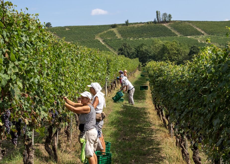In foto, da sinistra a destra: vendemmia in corso a La Ponca, Vallepicciola, Fontanafredda.